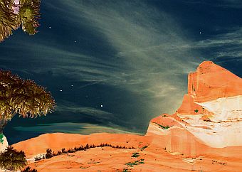 felsige Ebene. Es scheint dort unten kaum Wasser zu geben. Wir erkennen einen schmalen Streifen von Bäumen oder Sträuchern. Sie sind eher braun als grün gefärbt, genau wie die Bäume, unter denen wir stehen. Welche Art von Leben mag es sonst noch in dieser felsigen Wildnis geben? |