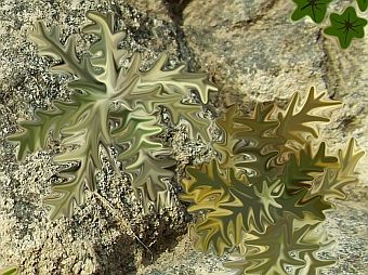 Gewächse fühlt sich genauso weich an, wie sie aussieht, aber die Blätter an sich sind zäh wie Leder. Wenn man die Pflanzen berührt, fangen sie an zu duften. Sie riechen wie eine Mischung aus Oregano und Honig, mit einem Hauch von Zimt dabei. Die grünen Sterne rechts oben stellen uns vor ein Rätsel. Sie sehen aus wie Algen, aber es scheint, als könnten sie sich bewegen. Vielleicht sind sie so etwas wie unsere irdischen Schleimpilze. Bei denen weiß man ja auch nicht, ob man sie nun zu den Tieren oder zu den Pflanzen zählen soll. |