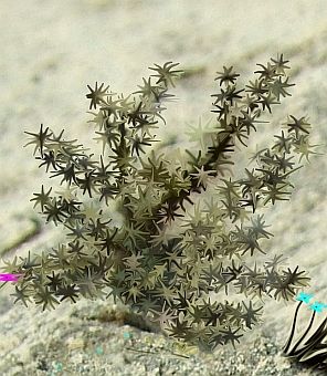 Sie besteht aus einem kräftigen kleinen Stämmchen und starren Zweigen, an denen sternförmige Gebilde sitzen. Die Sternchen sind anfangs dunkel und werden dann immer heller. Sie brechen sehr leicht ab und rollen davon, bis sie in irgendeiner Ritze hängenbleiben. Dort wachsen sie zu neuen Silberbüschen heran. Wir finden überall in der Umgebung solche winzigen Sträucher. Dieser hier ist knapp 50 cm hoch. Er ist weit und breit der größte seiner Art. |