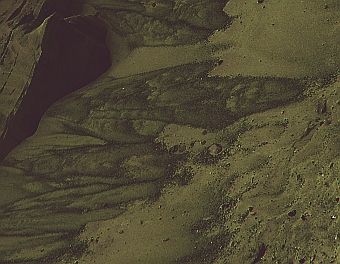 ausgedehnte Trockentäler, düster im Halbdunkel am Ende des Tages. Alles deutet darauf hin, daß hier einst Wasser geflossen ist. Wo mag es geblieben sein? An einigen Stellen schimmert es grünlich. Dort scheinen Pflanzen zu wachsen. In den nächsten Wochen werden wir auch diese gefrorenen Trockentäler näher untersuchen. |
