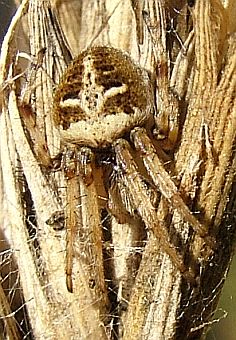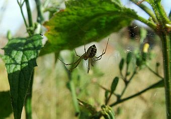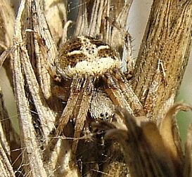 Es gehört einer Dornfinger-Spinne. Diese schönen, großen Spinnen haben sich einen festen Platz in meinem Garten erobert. Diese hier hat ihr Netz in eine Kerbel-Dolde gestellt. In einem ordentlich geputzten Garten mit kurzgeschorenem Rasen wäre so etwas natürlich nicht möglich. Wer Spinnen will, muß Wildnis dulden. |