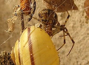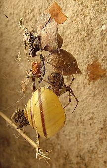 manchmal tun sie seltsame Dinge. Diese hier entdeckte ich neben meinem Garagentor. Sie scheint der Messie unter den Spinnen zu sein. Ich kann´s nicht beschwören, aber ich glaube nicht, daß das ganze Gerümpel nur per Zufall in ihr Netz geraten ist. Ich gehe eher davon aus, daß sie sich das ganze Zeug mühevoll an allerlei Fäden an Bord gezogen hat - vielleicht als Tarnung und Versteck. Mit dem leuchtend gelben Schneckenhaus hat sie dann allerdings keinen guten Griff getan. Aber vielleicht sieht sie das ganz anders. Wenn man genau hinschaut, hat das ganze Arrangement doch schon fast was von moderner Kunst. |