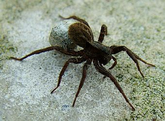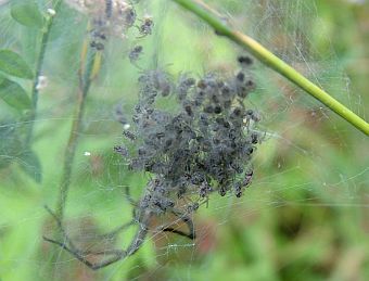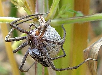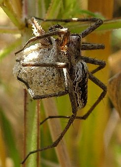Habichtskraut ist eine Listspinne. Sie ist hochschwanger. Bald wird sie einen Kokon spinnen, mit vielen winzigen Eiern darin. |