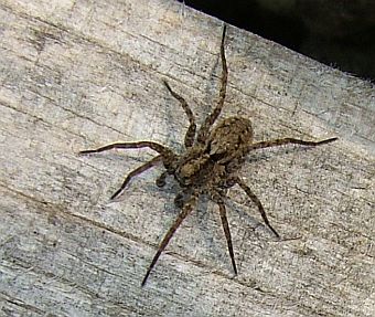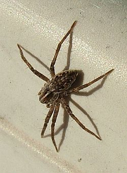 ihre Kokons mit sich herum, aber sie heften sie sich an die hinten sitzenden Spinnwarzen. Wenn sie mal müssen, pflücken sie den Kokon mit den Hinterbeinen ab und halten ihn sorgsam außer Schußweite. Ich habe das schon ein paarmal beobachten können - es sieht putzig aus. Bloß mit dem Fotografieren hat´s noch nicht geklappt. Wolfsspinnen sind sehr scheu, und wer läßt sich schon gerne auf dem Klo ablichten...! |