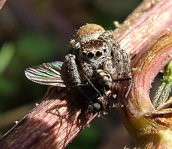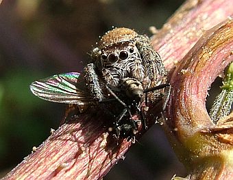Höhlen drehen - genau wie wir. Das gibt ihnen eine Ausdruckskraft, die man bei Spinnen normalerweise nicht vermutet. Leider sind gerade Springspinnen sehr klein und sehr scheu, so daß man nicht oft so nahe an sie herankommt. Aber die hier hatte eine so dicke Fliege unter dem Arm, daß sie nicht schnell genug wegrennen konnte. Sie würde es sich wahrscheinlich strengstens verbitten, als niedlich bezeichnet zu werden. Sie ist eine erwachsene Spinne, jawoll! Trotzdem finde ich sie einfach putzig. |